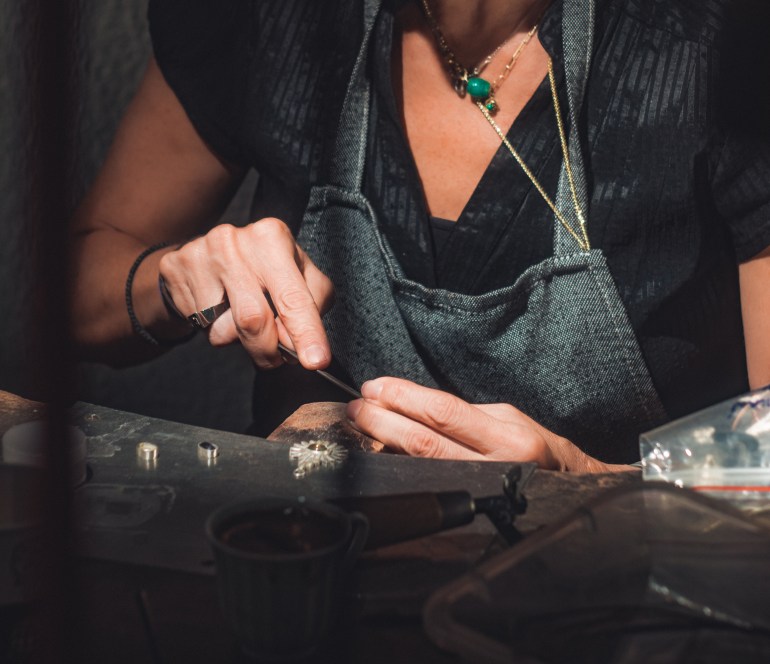 I use traditional metalsmithing techniques which means I shape the sheet metal by forging, dapping, filing, sanding, and soldering. The malleability of metal is amazing it’s always like making a mini sculpture. I also carve wax for some of my pieces. I work with sheet metal, sheet wax, and other wax materials. Working with these materials is meditative, and I find different ways of doing things when I sit working at my bench. You can also watch how I make my jewelry on my youtube channel. Please click here to watch how I made the sakura brooch.